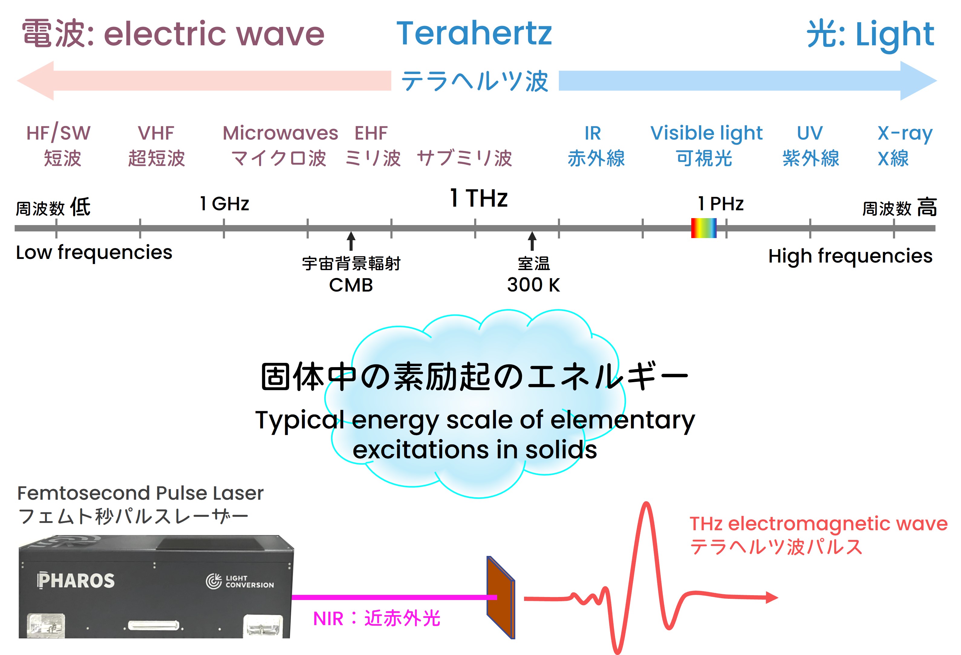 テラヘルツ波は、最も低エネルギーの「光」です。フェムト秒パルスレーザが発する近赤外光パルスから、テラヘルツ波を作ります。