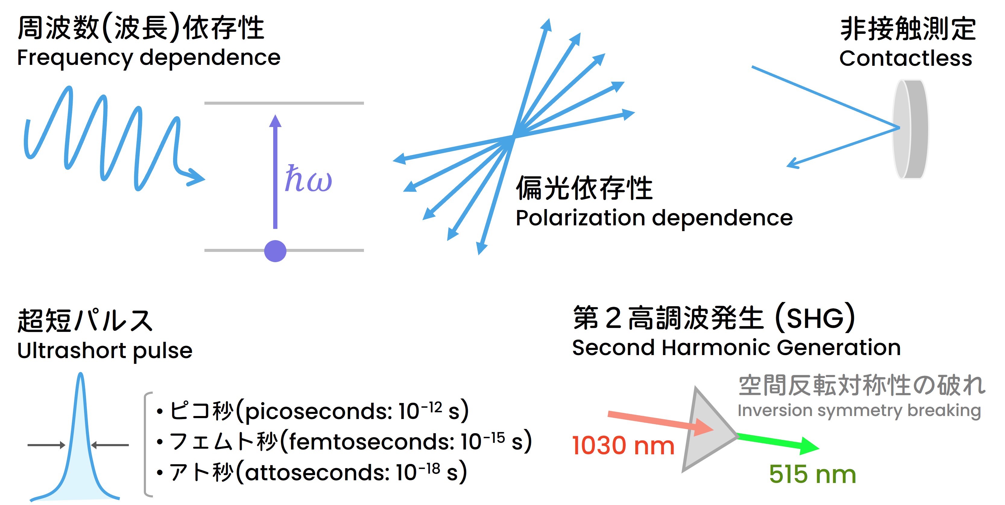 方向依存性:Orientational dependence超高速応答:Ultrafast responses 非接触:Contactless 反転対称性の破れ:Inversion symmetry breaking