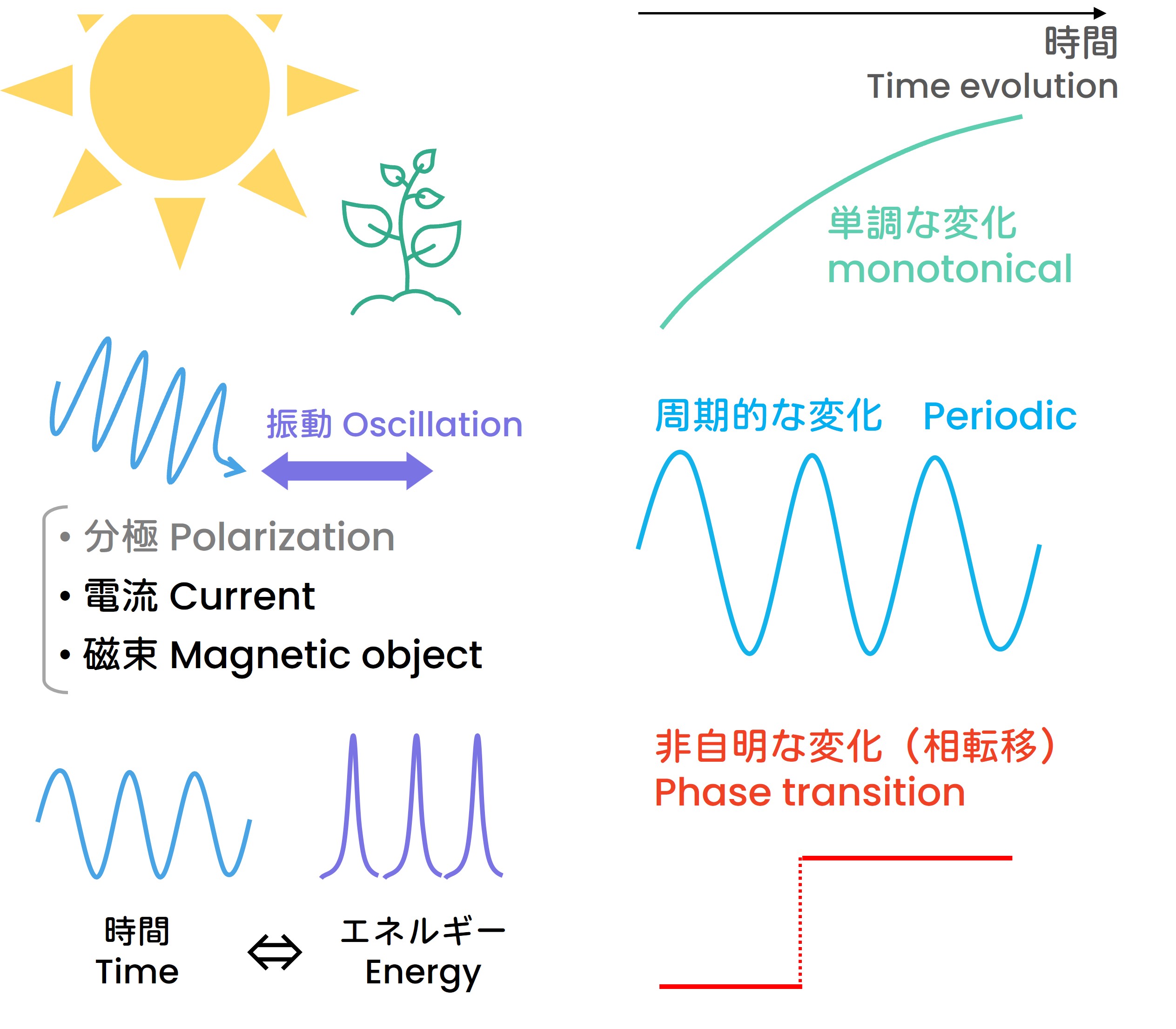 光は、振動する電場です。定常的に印加すると物質を壊してしまうような「強電場」を用いると、物質内部の準粒子を電磁気力で振動させたり、周期電場で変調することができます。