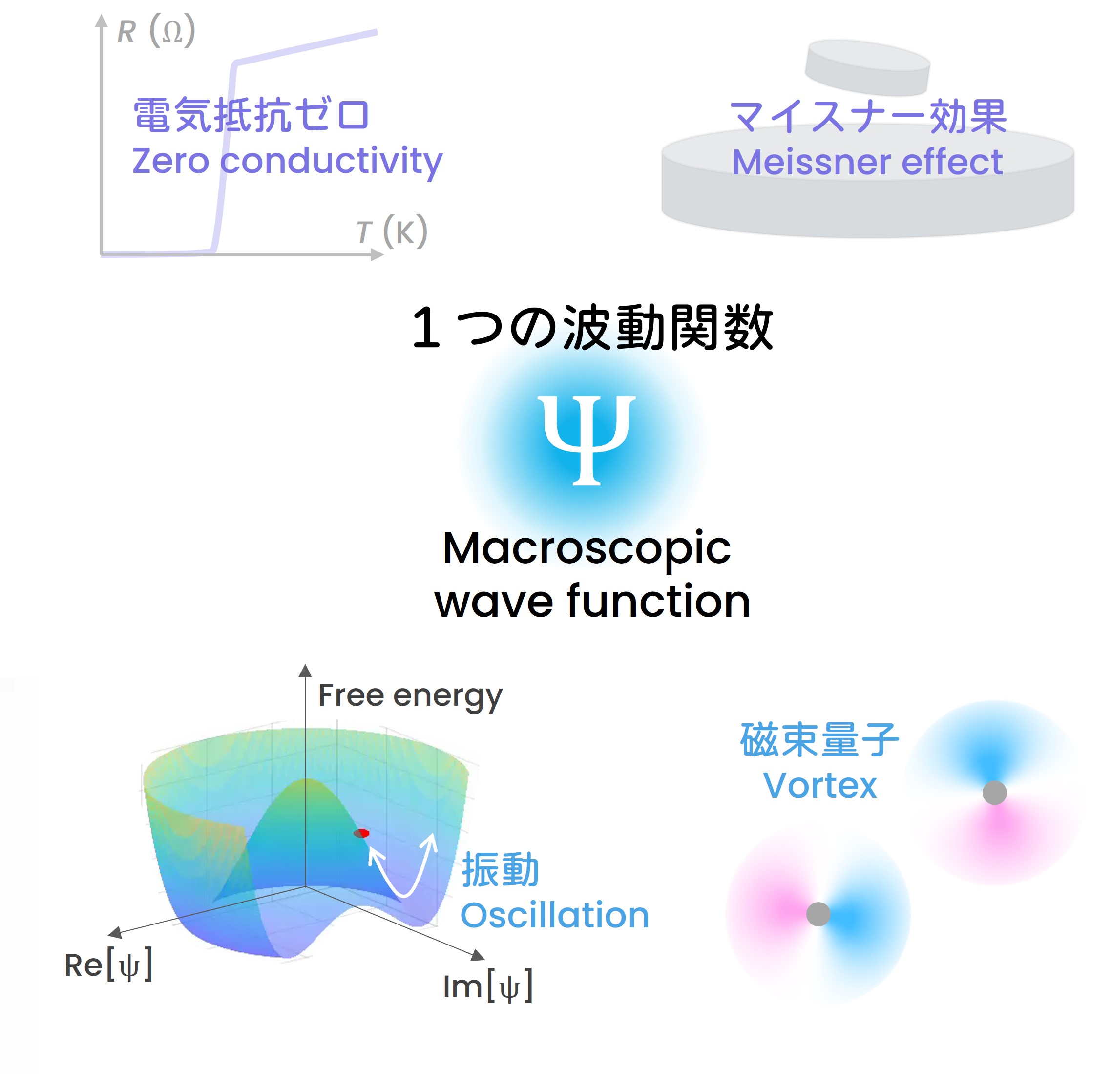 超伝導状態は、電気抵抗がゼロ、磁場が侵入できない(マイスナー効果)という特徴的な性質を示すだけでなく、1つの波動関数で表すことができる特殊な状態です。その波動関数Ψを、光で動かし研究します。